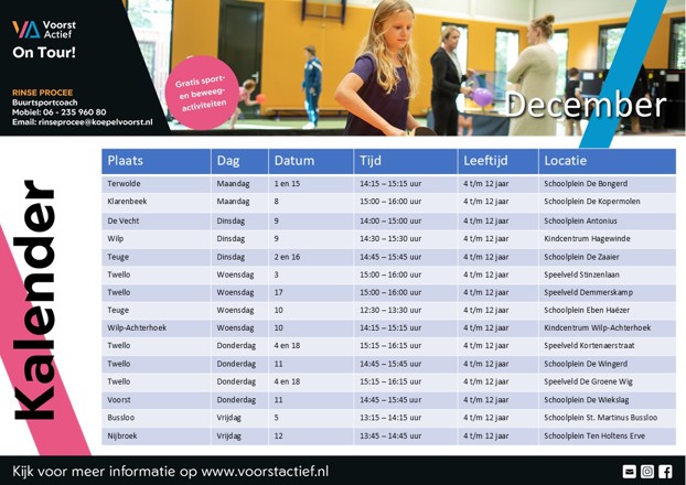 Team Voorst Actief organiseert dagelijks voor de kinderen in de leeftijd van 4 t/m 12 jaar gratis naschoolse sport- en beweegactiviteiten. Bekijk de onderstaande kalender wanneer we met onze activiteiten bij jou in de buurt zijn.